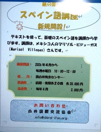 これまで要望の多かったスペイン語教室の昼間の部を来年4月から開講します。そこで新規会員を募集します。
