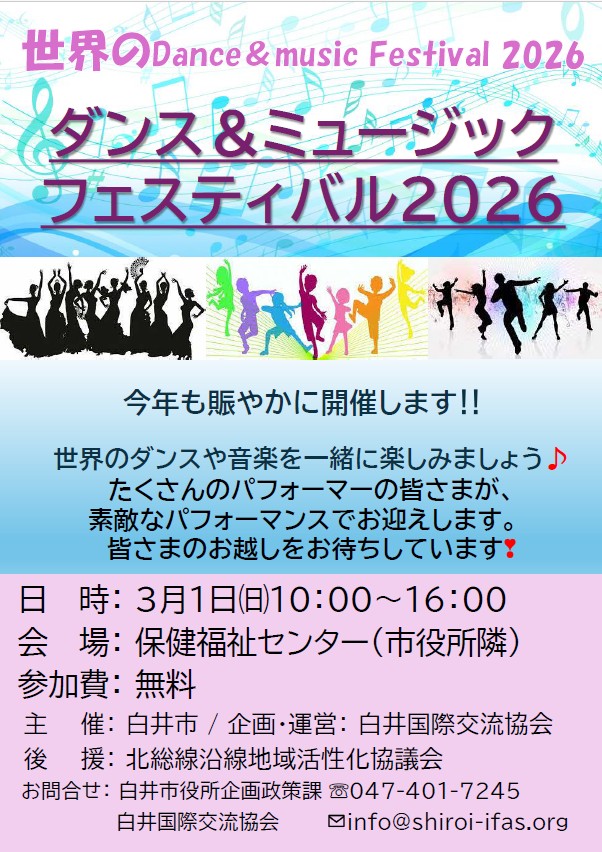 来る3月1日(日)に下記の日程で、世界のダンス&ミュージックフェスティバル2026を開催します。恒例となったこのイベント。毎年、多くの来場者の方に来ていただいています。ぜひ、皆さん、奮ってご参加ください。