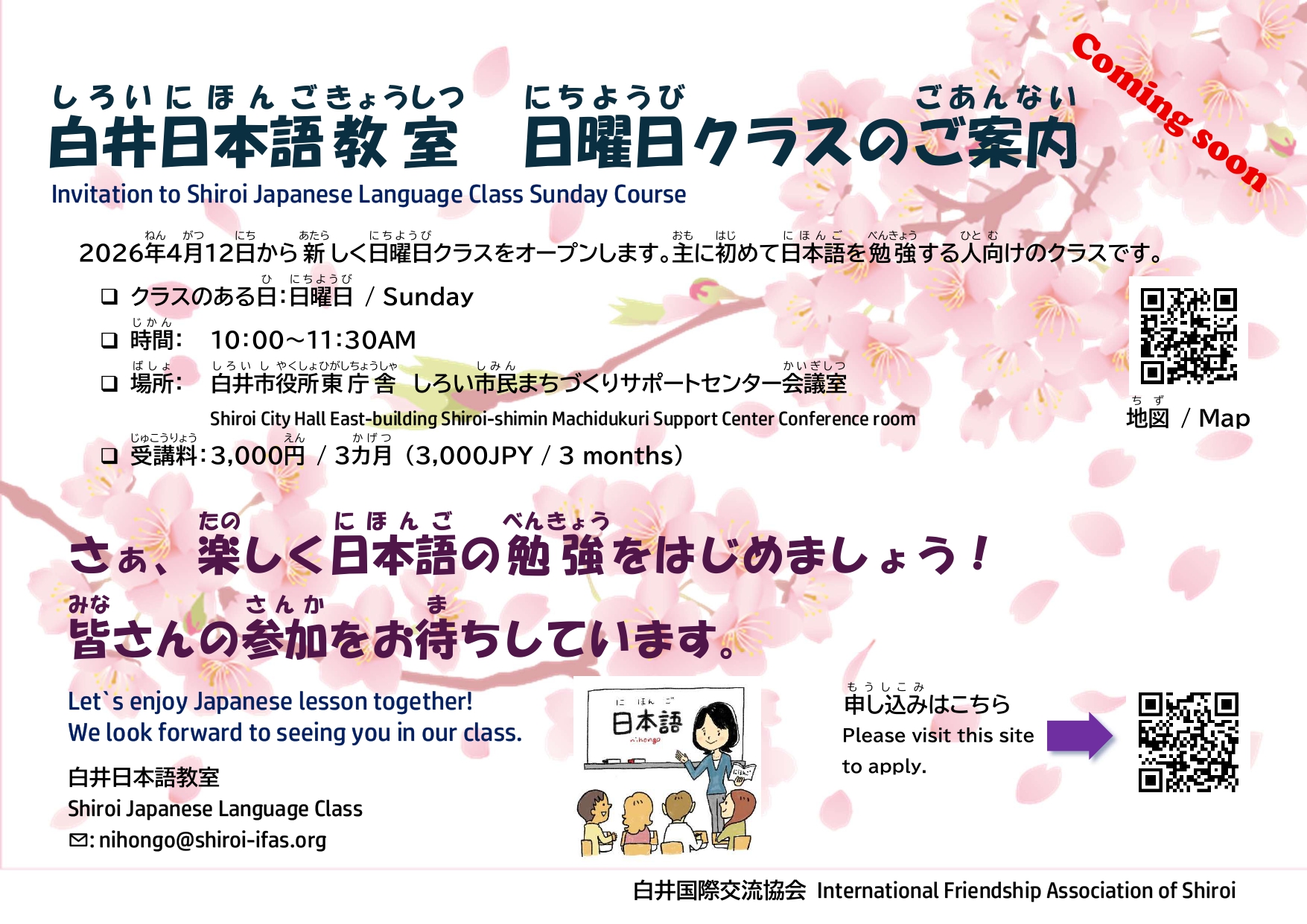 詳細は”白井日本語教室 日曜クラスのご案内”をご参照ください。