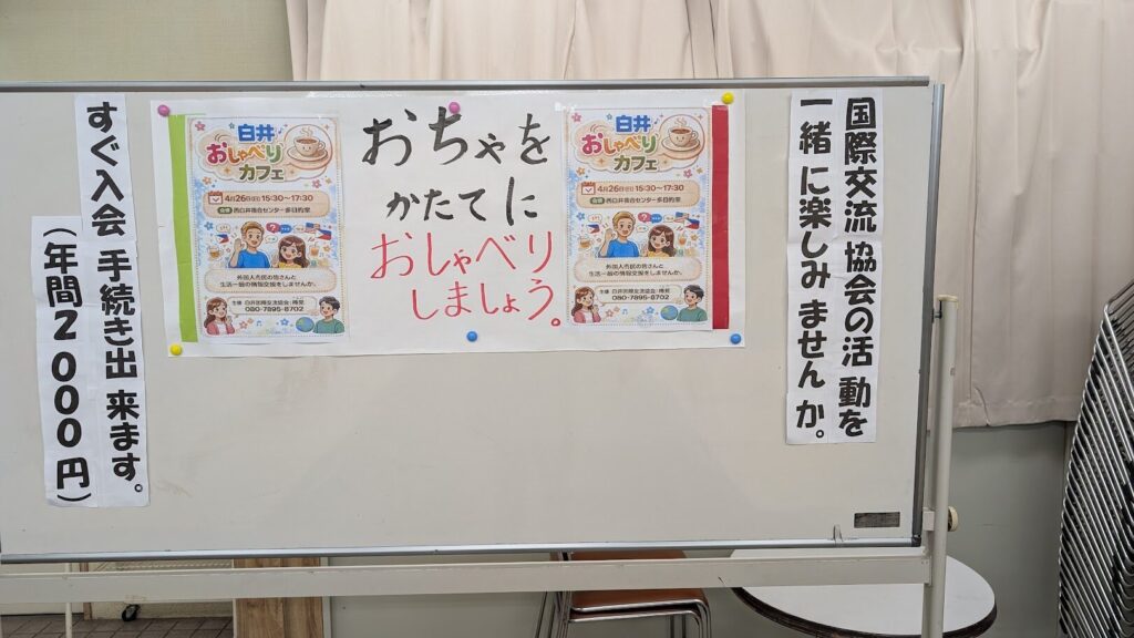 第1回白井おしゃべりカフェは外国人市民が12名、日本人市民が18名にお集まりいただき、お陰様で盛況のうちに無事終了出来ました。次回の開催は、5月24 日(日)午後3時30分~、場所は今回と一緒で西白井複合センター多目的室(1階)、会費は無料です。